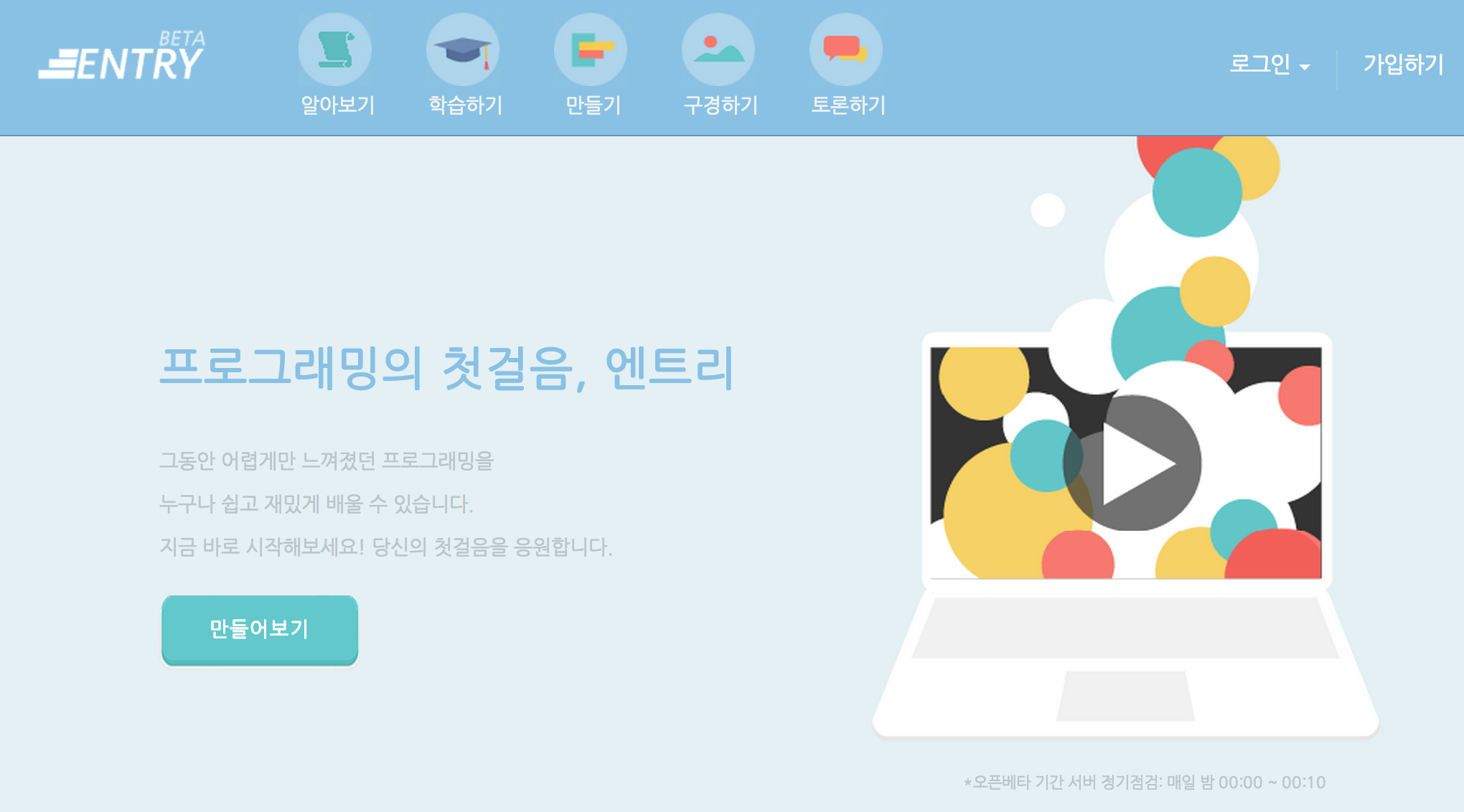 사실 저는 비전공자로서 컴퓨터 프로그래밍 공부에 있어서 어려움을 많이 느꼈어요. 만들고 싶은 것은 많은데 진입 장벽이 너무 높아서 좌절하기 일수였죠. 엔트리는 저 같은 사람들을 위해 만든 서비스예요. 엔트리는 한마디로 말하자면 누구나 쉽게 프로그래밍의 원리를 배우고, 이 것을 이용하여 창작물을 만들 수 있는 온라인 플랫폼입니다. 미국의 MIT에서 만든 스크래치라는 교육용 프로그래밍 언어의 방식을 채택하여 이를 플랫폼 차원으로 발전시켰습니다.