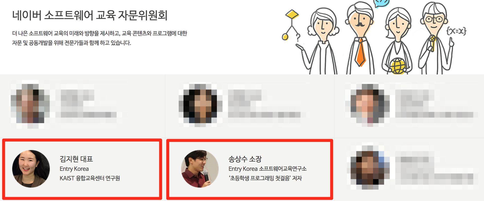 또한 네이버에서 아이들에게 소프트웨어 경험을 주기 위한 ‘소프트웨어야 놀자’라는 서비스가 있습니다. 이 서비스의 파트너이자 자문위원으로도 활동을 하고 있습니다. 엔트리에서 교육개발책임연구를 맡고 있는 송상수 선생님(교육회사인 엔트리는 이름 뒤에 선생님이라는 호칭이 통일되어 있습니다, 네이버 인물검색)도 함께 자문위원에 속해 있습니다.