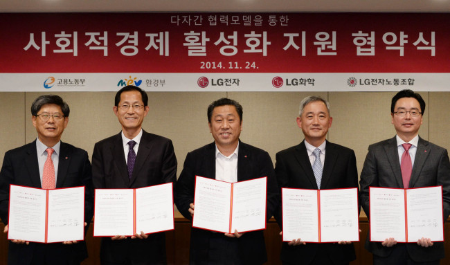 LG전자와 LG화학이 고용노동부, 환경부와 손잡고 사회적경제 주체에 대한 종합적인 지원을 시작한다. 양사는 24일 오후 여의도 LG트윈타워에서 고용노동부, 환경부와 ‘사회적경제 활성화 지원’을 위한 협약(MOU)을 체결했다.