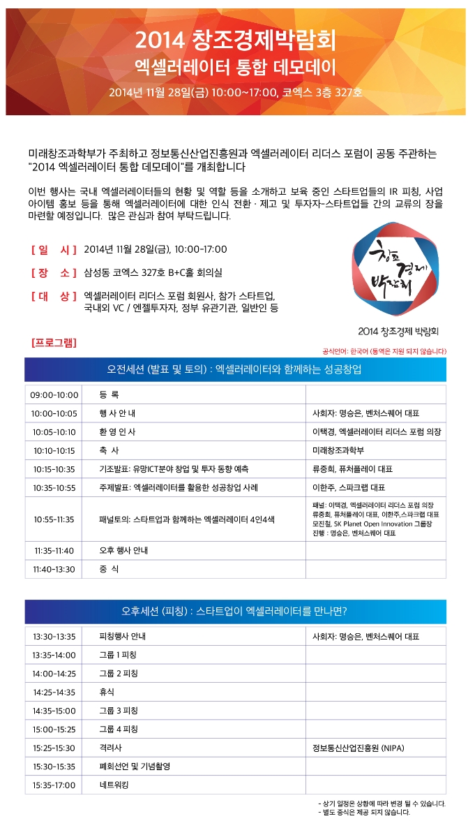 미래창조과학부가 주최하고 정보통신산업진흥원과 액셀러레이터 리더스 포럼이 공동 주관하는 ‘2014 엑셀러레이터 통합 데모데이’가 오는 28일 삼성동 코엑스에서 열린다.