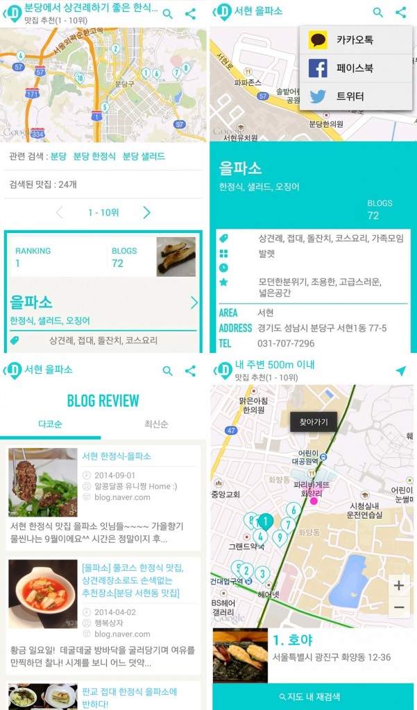 이 밖에 SNS 공유 기능을 강화해 맛집 관련 포스팅을 즐겨하는 유저들이 맛집 검색 결과나 맛집 상세 페이지를 카카오톡, 페이스북, 트위터 등의 SNS에 공유하기 쉽도록 구성했다.