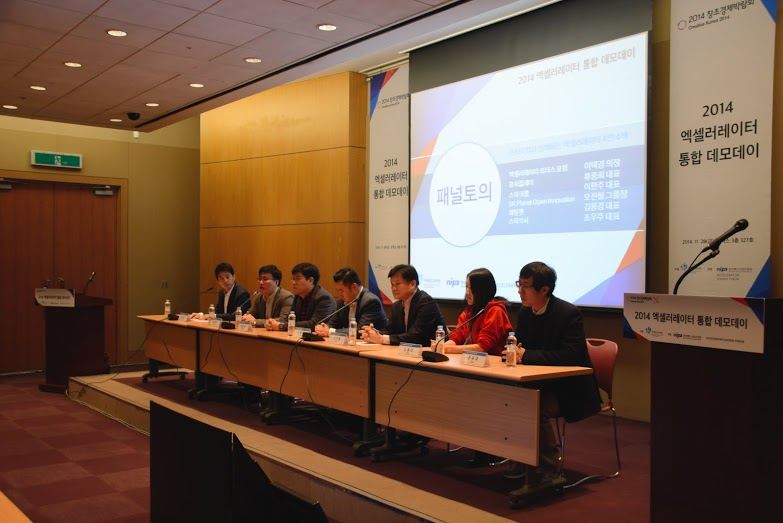 국내 유수의 액셀러레이터들이 참여한 가운데, 오전 세션의 하이라이트는 5명의 액셀러레이터와 2명의 스타트업 대표가 참여한 패널토의 세션이었다. 액셀러레이터 패널로는 이택경 프라이머 대표 겸 액셀러레이터 리더스 포럼 의장, 류중희 퓨처플레이 대표, 이한주 스파크랩 대표, 모진철 SK Planet 오픈 이노베이션 그룹장과 토의진행을 맡은 명승은 벤처스퀘어 대표가 참여했다. 스타트업 대표 패널로는 채팅캣의 김용경(April Kim) 대표, 스파코사 조우주 대표가 참여했다.