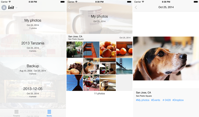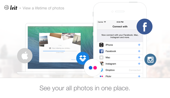 라이트(leit)는 사용자의 인생과 추억을 담은 모든 사진을 한 곳에서 보여주고 공유하는 서비스이다. 맥, 드롭박스, SNS(페이스북, 인스타그램, 플리커)에 흩어져있는 사진의 위치를 각각 알려줌과 동시에 시간과 장소 순, 기기 별로 정렬하여 직관적인 타임라인에 보여준다. 또한, 사용자의 사진뿐만 아니라 사용자가 태그된 사진도 자동으로 보여주어 다른 사람들과의 추억도 공유할 수 있다. 이미 여기저기에 작게 정리된 사진들을 다 불러모아 다시 정리할 수 있도록 도와주기 때문에 라이트로 사진을 불러온 후 수정하는 정보는 우리에게 쌓이게 된다. 그 정보를 통해 라이트를 꾸준히 사용하게끔 만들었다.