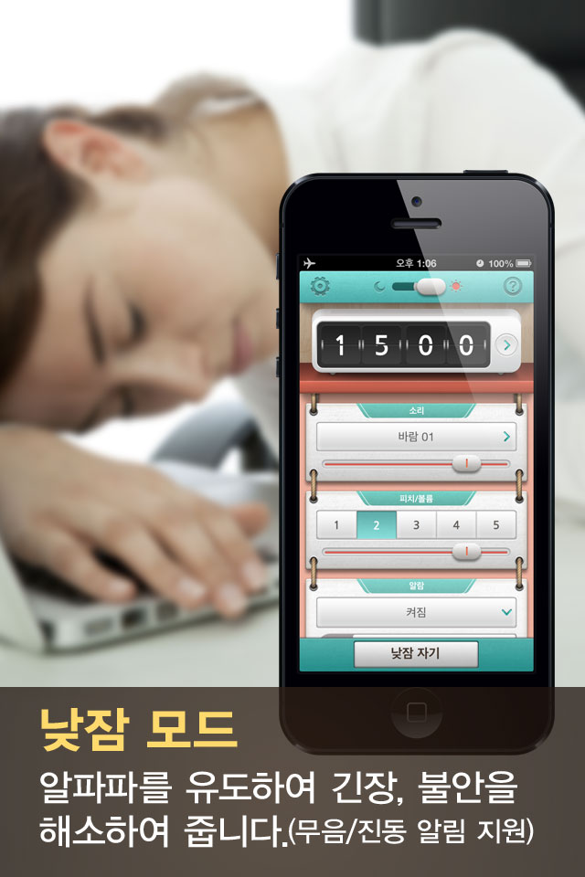 수면부족과 불면증에 시달리는 현대인을 위한 앱 ‘굿슬립’은 깊은 잠을 잘 수 있도록 돕는 앱으로, 낮잠을 잘 때는 알파파를 유도해 긴장과 불안을 해소해 주고 밤에는 세타파를 유도해 불면증을 없애 준다.