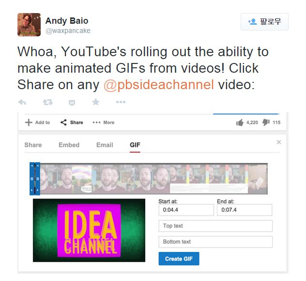 유튜브에서 동영상 공유 서비스의 일부로 ‘GIF 파일 생성’ 기능을 추가했다. 일명 ‘움짤’이라 불리는 짧은 동영상을 유튜브 페이지에서 벗어나거나 별도의 툴을 사용하지 않고도 손쉽게 만들고 공유할 수 있게 된 것이다.