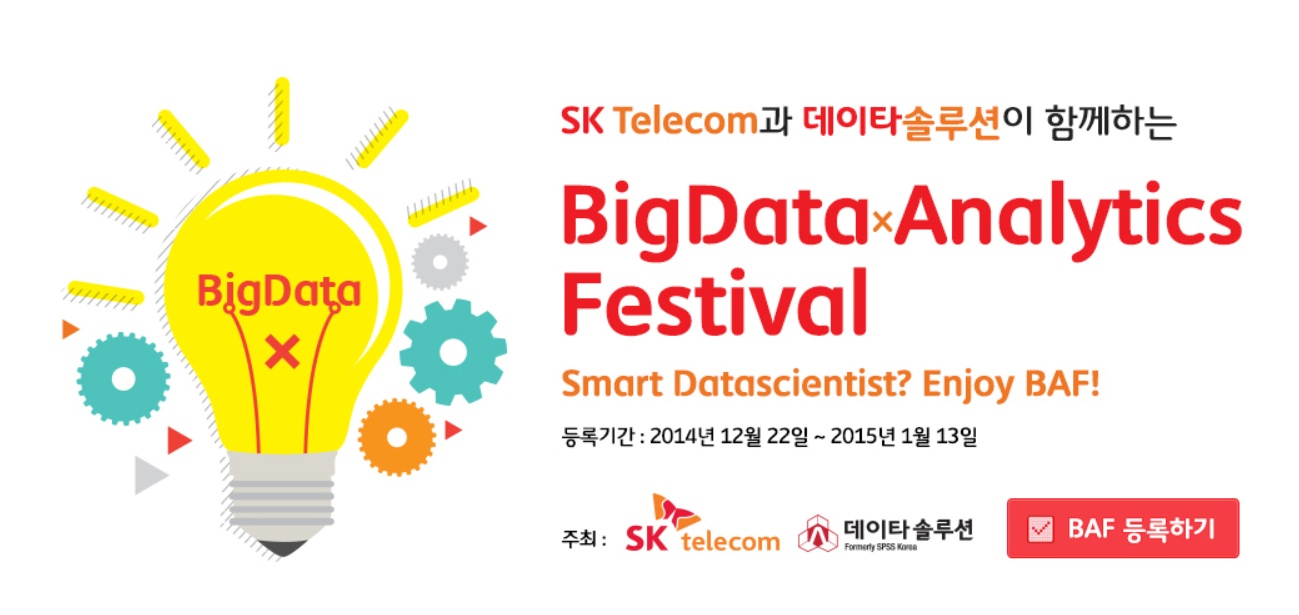 SK텔레콤은 (주)데이타솔루션과 함께 빅데이터 시대를 이끌어갈 역량 있는 인재 발굴을 위해 ‘빅데이터 경진대회(Bigdata Analytic Festival, BAF)’를 개최한다.