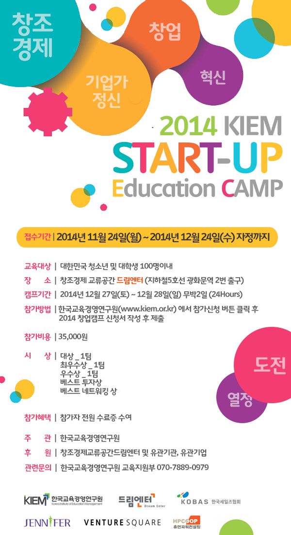 한국교육경영연구원은 창조경제교류공간 드림엔터에서 오는 27일~28일 양일간 청소년 및 대학생을 대상으로 제1회 “KIEM 청소년 대학생 창업교육캠프, 24hours IDEA Party”를 진행한다.