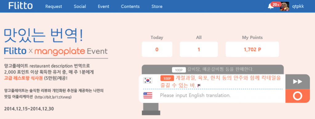 소셜 번역 플랫폼 플리토와 맛집 추천 모바일 서비스 망고플레이트는 지난 15일부터 콜라보레이션 이벤트를 진행하고 있다. 망고플레이트는 플리토를 홍보해주고, 플리토는 망고플레이트에 남겨진 유저들의 식당 정보를 영어로 번역해주는 방식이다. 이를 통해 플리토는 유저들을 확보하고, 망고플레이트는 한국을 찾는 외국인 관광객과 국내 거주 외국인 등 새로운 시장을 개척하게 될 전망이다.