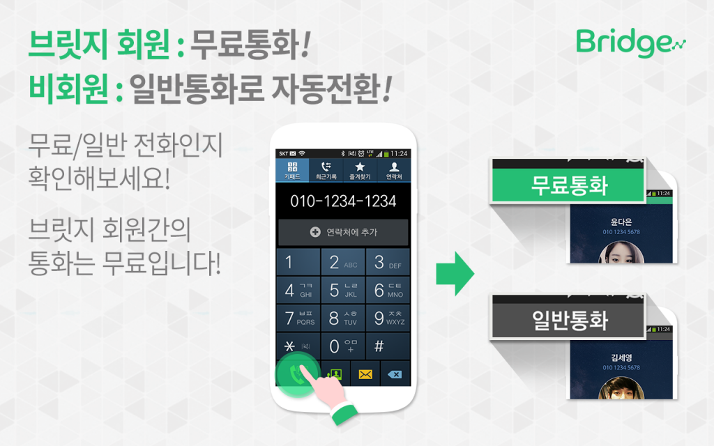 브릿지콜은 ‘할머니도 쓰실 수 있는’ 원클릭 무료통화 솔루션이다. 설치한 앱을 실행하지 않고도 무료통화 서비스가 제공된다. 또한, 상대방이 브릿지콜 가입 회원이 아니거나 인터넷 상태가 안 좋을 경우에는 자동으로 일반통화로 전환된다.