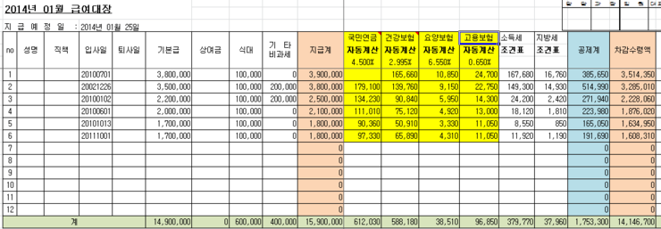 급여 지급 시 4대 보험 및 소득세/지방 소득세를 공제하여 임금대장을 작성합니다.