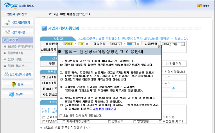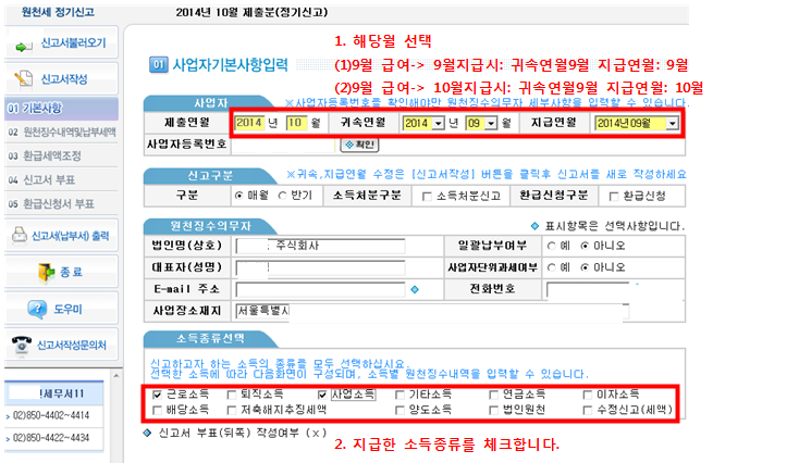 [세금신고]—>[원천세 신고]를 클릭합니다.