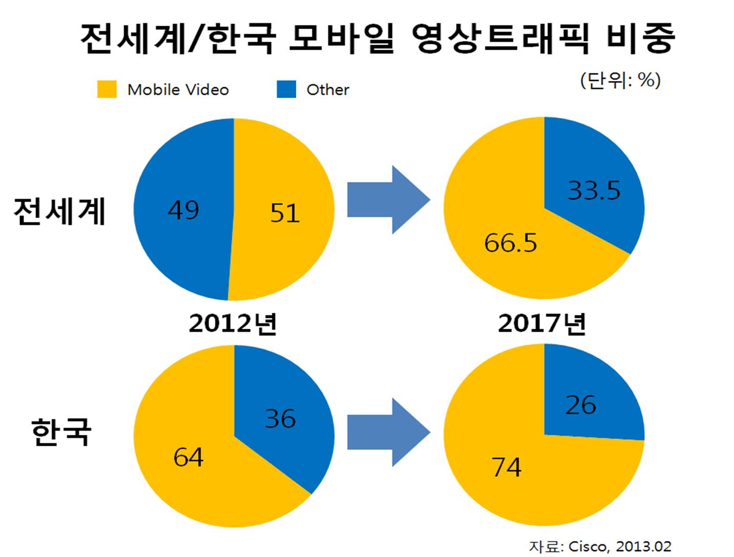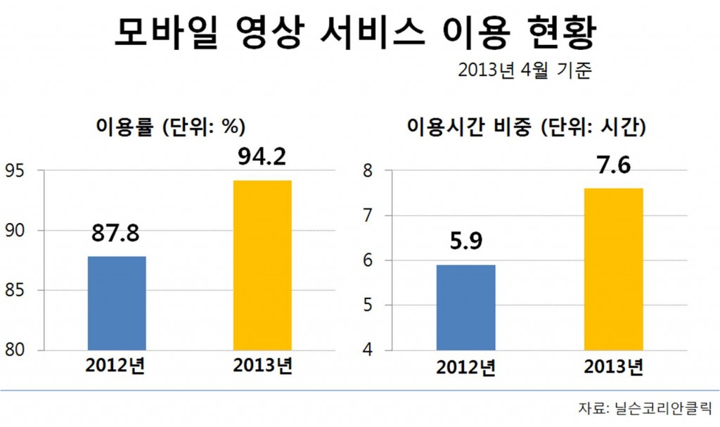 모바일 영상 서비스의 급격한 성장은 이제 TV를 위협하고 있습니다. 모바일 기기의 휴대성과 무제한 데이터 요금의 등장으로 사용자는 장소에 상관없이 영상을 시청 할 수 있습니다. 또한 휴대폰 디스플레이의 대형화와 모바일 영상 콘텐츠의 증가는 모바일 영상 서비스의 이용환경을 개선시키고 있습니다. 국내 이동통신 3사는 모바일IPTV와 통신 서비스를 결합한 패키지 요금제를 제공하는 등 모바일IPTV 사용자 확보를 위해 노력하고 있어 모바일 영상 서비스를 이용하는 사용자의 수는 꾸준히 증가할 전망입니다. 이에 따라 2014년 8월 정부는 모바일 영상 시청을 시청점유율에 포함시키는 개정안을 발표하기도 했습니다.