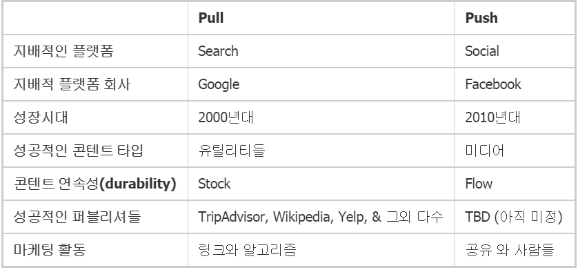 Chris Dixon 의 글 Two eras of the internet: pull and push 은 Pull은 검색(구글) vs Push는 소셜(페이스북) 이라고 정의하고 비교합니다.