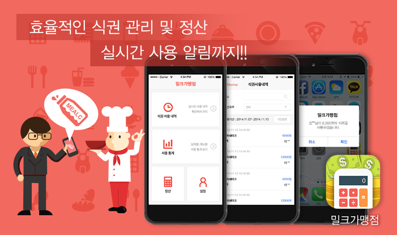 또한 매일 오후 10시에 당일의 식권 매출 내역이 점주에게 문자 메시지로 전송되므로, 식대장부 및 종이식권으로 거래할 때의 번거로운 정산 업무에서 해방될 수 있다.