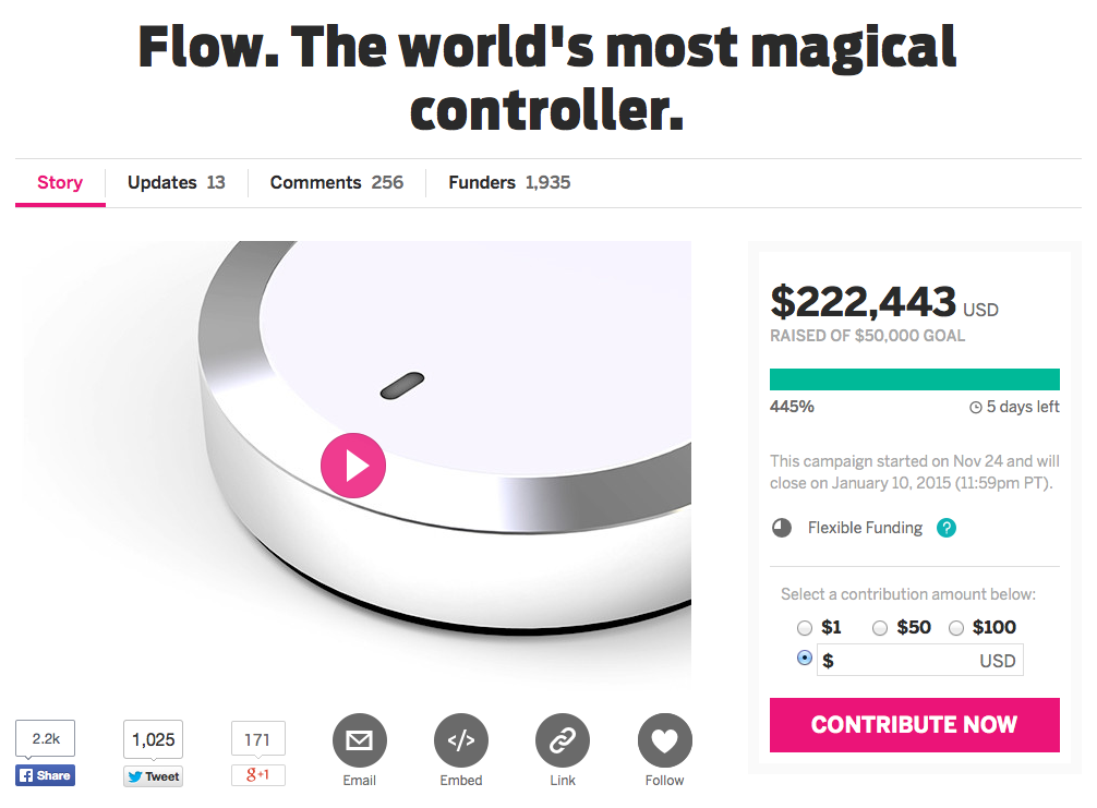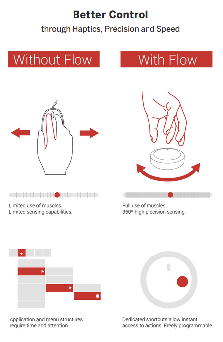 인디고고에서 목표금액 대비 400% 이상의 펀딩을 받고 있는 플로우(Flow)는 립 모션이 추구했던 입력방식에서 한단계 더 진화한 방식을 제안하고 있습니다. 립 모션과 같은 형태의 입력 방식 뿐만 아니라 하드웨어를 통한 터치와 다양한 활용이 기대되는 다이얼(Dial)을 통해 보다 상황에 맞게 입력장치를 활용할 수 있을 것으로 생각됩니다. 예컨데 창업자들이 이야기 하는 것처럼 음악의 재생이라던가 이미지, 비디오 작업등과 같은 정밀한 내비게이션이 필요한 경우에 모션 인식모다 확실히 메리트가 있고 가치가 있어 보입니다.