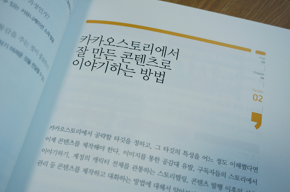 단순히 카카오스토리만 다루는 것이 아니라 카카오스토리와 다른 어떤 채널과 결합해서 활용해야 할지, 주체별로 맞는 채널구축부터 시작해서 카카오의 파생서비스들, 옐로우 아이디, 카카오톡플러스도 같이 살펴볼 수 있게 했구요. 무엇보다 예제를 많이 활용해서 아예 카카오스토리를 모르시는 분들도 따라할 수 있는 실용서처럼 꾸몄습니다.