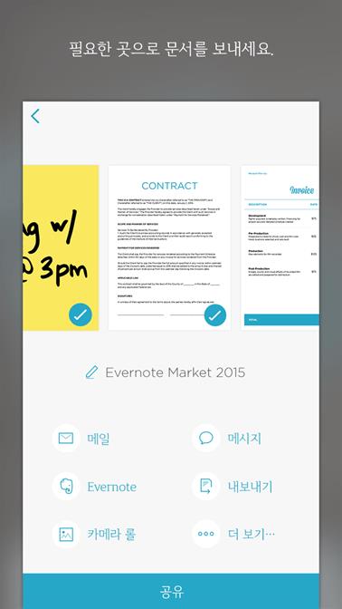 또한 스캔 파일을 이메일과 SMS, AirDrop으로 공유하거나 Evernote, iCloud 등 클라우드 서비스에 저장할 수 있다.