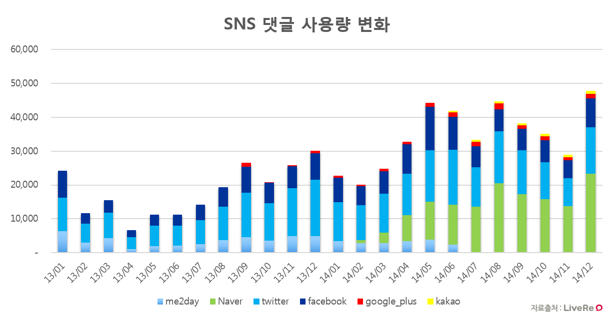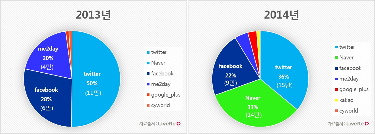 지난 2013년도 소셜댓글을 작성한 계정은 트위터가 압도적으로 많은 50% 이상을 차지했으며, 그 뒤를 페이스북과 미투데이가 이어갔다. 2013년 대비 2014년에 일어난 큰 변화는 미투데이가 서비스를 종료하고 2월 네이버 API, 6월 카카오 API가 라이브리에 적용됐다. 이로 인해 2014년 소셜댓글을 작성한 계정은 트위터가 36%로 33%를 차지한 네이버를 근소하게 앞섰으며, 그 뒤를 페이스북이 차지했다.