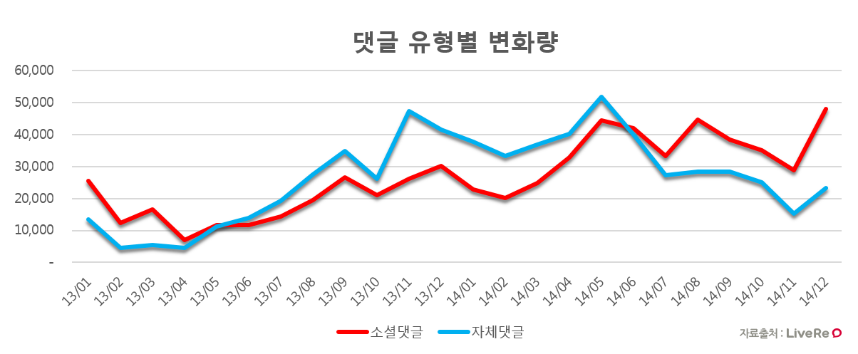 소셜댓글 서비스 라이브리가 2013년 1월부터 2014년 12월까지 주요 언론사 소셜댓글 사용량을 분석한 결과를 발표했다.