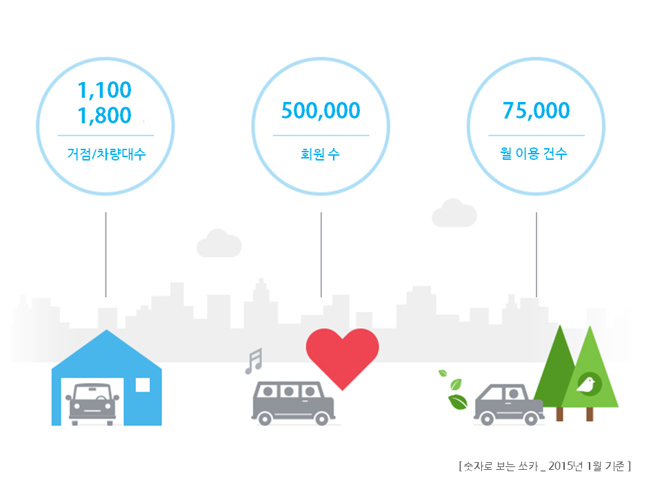 쏘카의 국내 카셰어링 누적 가입자는 약 50만 명으로 작년 한 해 약 5배 이상 성장했고, 지난 해 누적 이용건수는 약 52만 건으로 하루 평균 2,500~ 3,000여명이 이용하는 서비스가 됐다. 이용자 확대에 따라 지난 해만 약 700개 거점과 1,400여대 차량이 신규로 추가됐다.