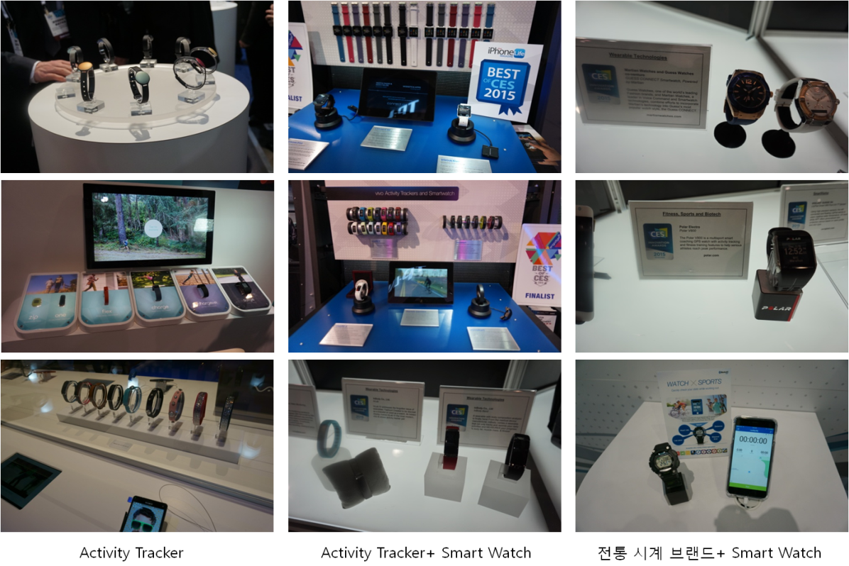 그리고 올해 애플의 iWatch 출시 영향으로 밴드 형 피트니스 트레커와 시계 형 웨어러블 트레커 및 기존 시계 브랜드의 스마트워치등 포함해서 60여종의 유사 제품이 전시되었다. 스마트워치의 경우 중국을 중심으로 한 10여 곳의 중소기업 제품 이외에도 삼성, LG, 소니, 화웨이와 같은 대기업도 신제품을 출품했으나 외형적으로나 기능적으로 스마트폰과 연동해서 일부 오디오 중심의 서비스를 제공하거나, 만보기와 같은 피트니스 기능을 제공하는 수준에서 크게 벗어나지 않았다. 이러한 제품은 기존 200$ 고가 제품 위주의 시장에서 Razer Nabu X 나 Jawbone Up Move와 같이 50$ 이하 가격으로 기본적인 피트니스 트레커 기능을 제공하는 저가 제품에 관심을 가지는 참관객이 많았다.