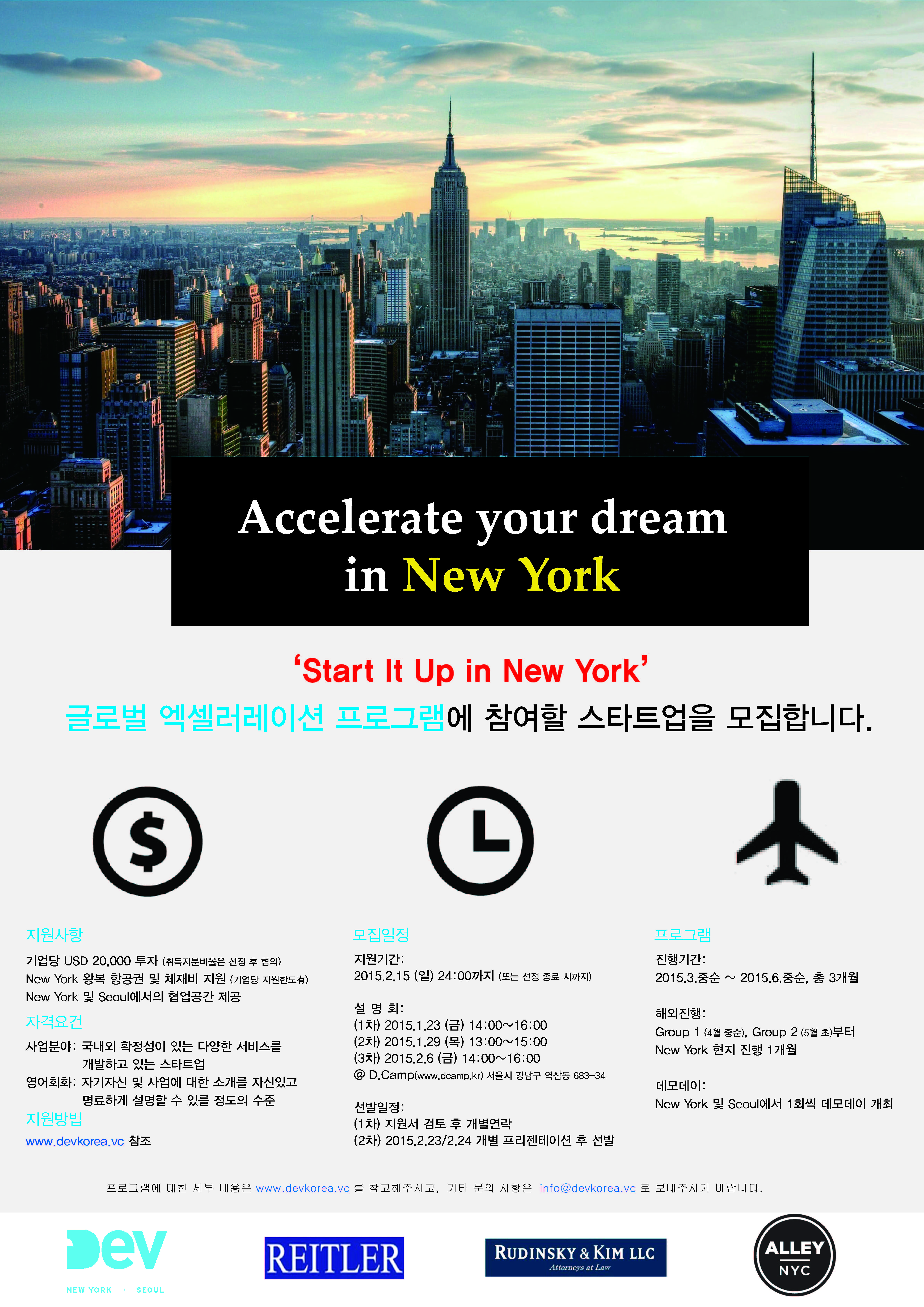 데브코리아(DEV Korea)는 스타트업의 성장과 투자유치 지원을 위한 ‘스타트업 인 뉴욕(Start it Up in New York) 2015년 상반기 프로그램에 참여할 새로운 기수를 1월 13일부터 모집한다고 밝혔다.