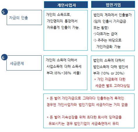반면, 법인기업의 법인이 사업주체가 됩니다. 출자자인 주주는 출자금액 한도내에서만 유한책임을 지며,사업성과는 법인계좌에 귀속되며, 법인세란 이름으로 법인명의의 세금이 부과됩니다. 법인의 이익을 개인이 빼가는 방법은 주주는 배당으로,대표자는 급여란 명목으로 가져가며 물론 여기에 대해서도 배당은 배당소득세, 급여는 근로소득세란 이름의 세금이 부과됩니다. 개인사업자와 법인기업의 주요 차이점은 다음과 같습니다.