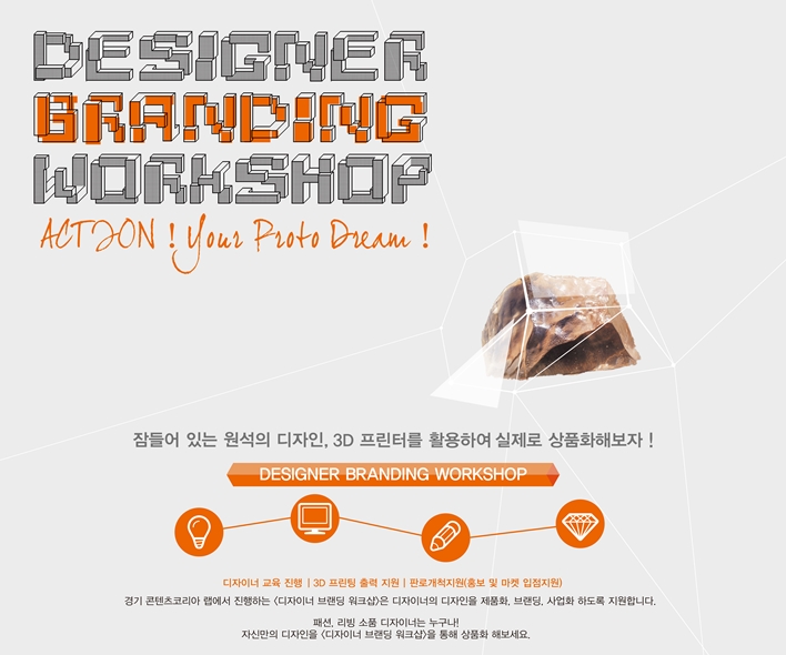 경기 콘텐츠코리아 랩에서 디자이너의 창의적 디자인을 3D 프린터로 제작하여 브랜딩 컨설팅과 판로개척까지 지원하는 ‘디자이너 브랜딩 워크샵’ 참여할 디자이너를 모집한다.