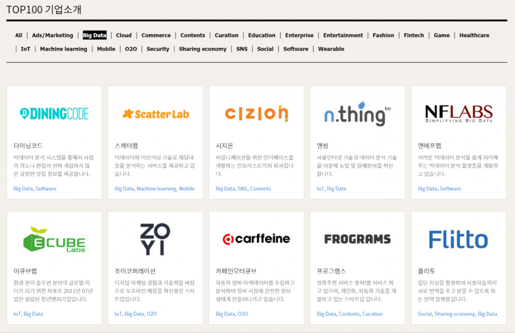 톱 100에는 IoT(Internet of Things), O2O(Online To Offline), 머신러닝(Machine Learnig•기계학습) 등 주목해야 할 스타트업들이 총망라돼 있어 관련 업계뿐만 아니라 투자자들이 참고할만큼 유용하다.