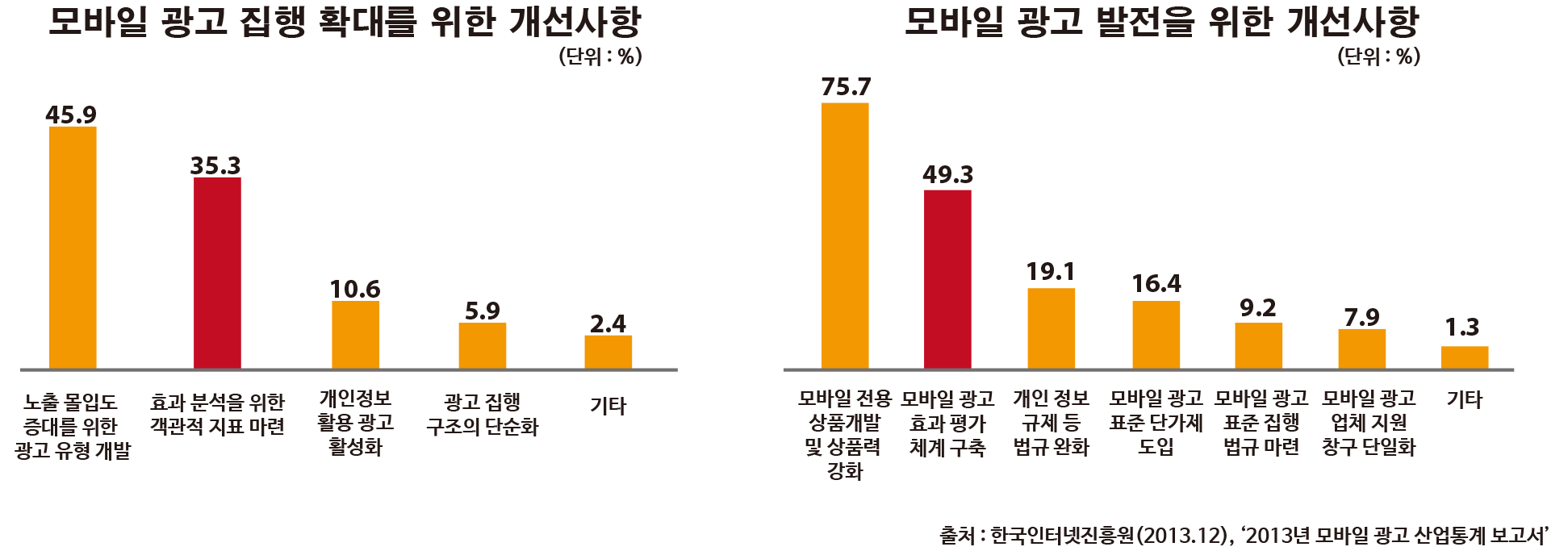 국내 모바일 광고시장이 성장함에 따라 모바일 광고효과를 분석하고 마케팅에 활용할 수 있는 도구들의 필요성이 증가하고 있습니다. 2013년 12월 한국인터넷진흥원에서 광고주를 대상으로 ‘모바일 광고집행 확대를 위한 개선사항’을 조사한 결과 ‘노출 몰입도 증대를 위한 광고유형 개발’(45.9%) 다음으로 ‘효과 분석을 위한 객관적 지표 마련’이 35.3%로 집계되면서 광고주는 더 세분화되고 정교한 데이터 분석을 원하는 것으로 나타났습니다. 이에 일본의 애드웨이즈, 미국의 Tune, App Annie, 이스라엘의 Appsflyer 등 선진 기술을 가진 해외 기업들이 국내 모바일 광고시장으로 활발히 진출하고 있습니다. 국내 모바일 앱 트래킹 시장의 경쟁이 치열해지고 있는 가운데 국내 기업들 또한 모바일 앱 트래킹에 대한 연구를 지속적으로 실시하고 해외 서비스의 취약점을 보완하는 등 국내 실정에 맞는 모바일 앱 트래킹 솔루션을 제시해야 하겠습니다.