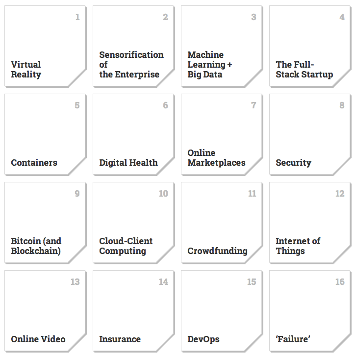 실리콘밸리에서 가장 영향력있는 VC 중 하나인 Andreessen Horowitz (줄여서 “a16z”) 에서 발표한, 16가지 관심 주제. 여기에 가면 볼수 있음. 각각의 주제별로, 파트너들이 예전에 썼던 블로그 글 등이 링크되어 있음. 실리콘밸리의 리딩 VC중 한곳이 어떤 분야에 관심을 갖고 있는지 간접적으로나마 볼수 있는 기회.