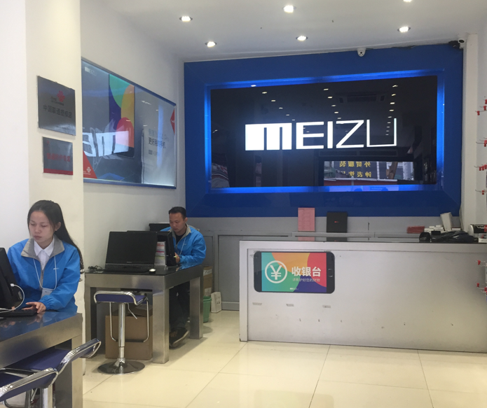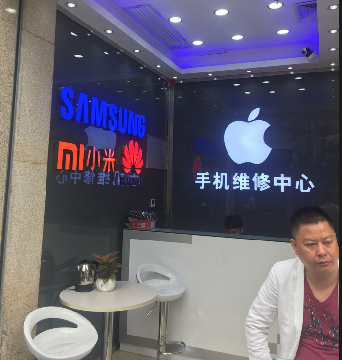 휴대폰수리센터에 붙어있는 로고를 보면 어느 회사 제품이 가장 인기인지를 알 수 있을 것 같다. 애플, 삼성, 샤오미, 화웨이 로고가 붙어있다.