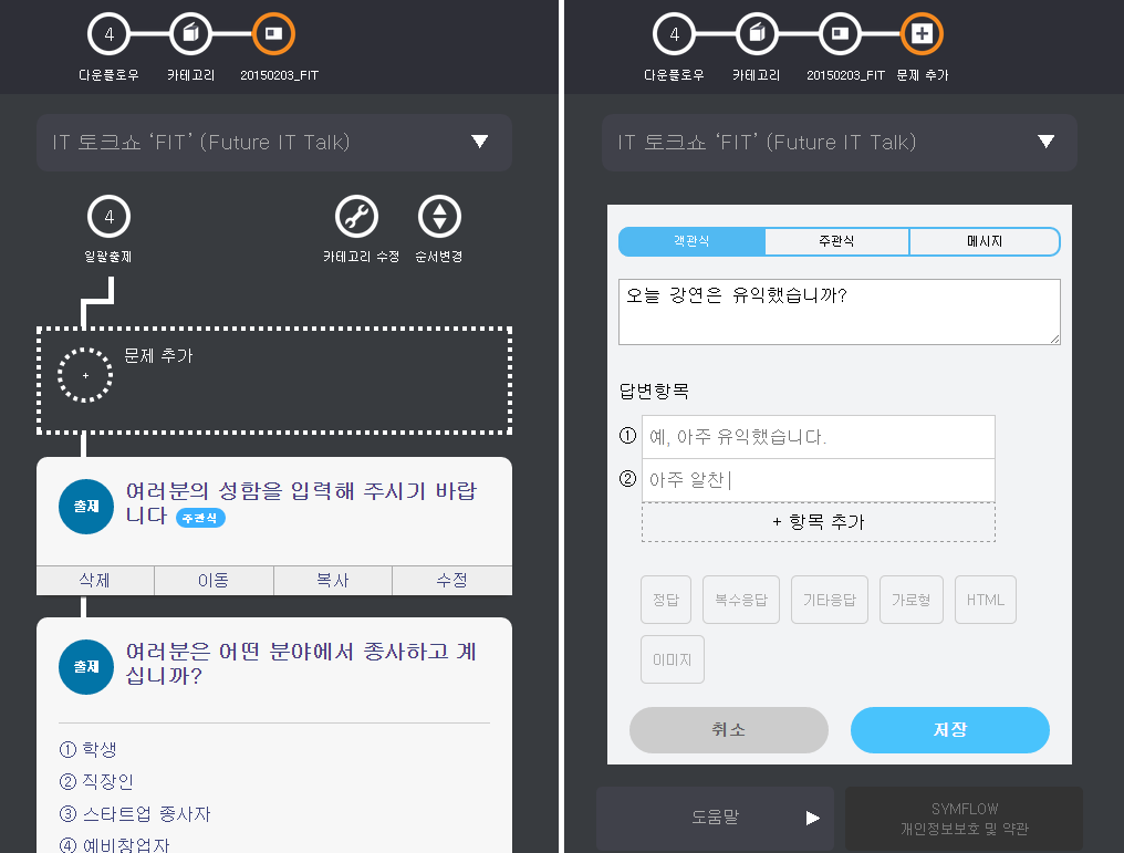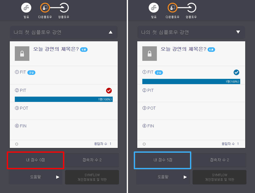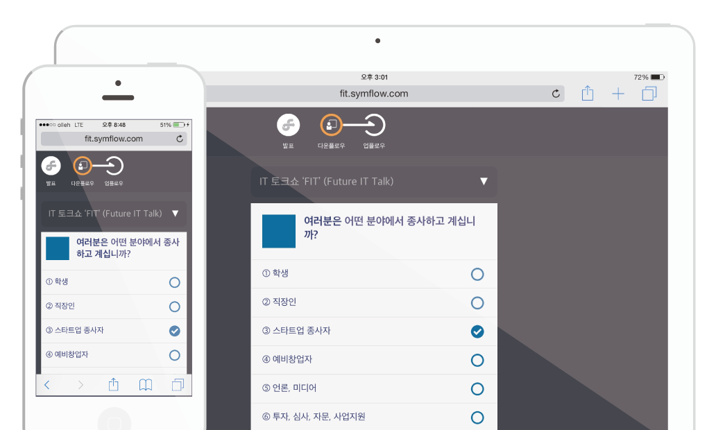 ‘심플로우’는 ‘심포니(Symphony)’의 ‘심(Sym)’ 과 ‘플로우(Flow)’의 합성어로서, ‘함께 공감하여 흐름을 만들어 가는 것’을 의미합니다. 기술적으로는 ‘Html5’로 구성된 웹앱 형태로, 별도의 앱을 내려받지 않고, 전용 인터넷 주소에 접속하는 것 만으로도 그 기능을 즉시, 100% 활용할 수 있는 것이 가장 큰 특징 입니다. 발표자는 별도의 전용 접속 주소를 통해 내 강연 시나리오에 맞는 설문내용을 미리 준비하거나 발표 자료를 관리할 수 있고, 일반 청중들은 인터넷에 접속할 수 있는 기기만 있다면 누구나 편리하게 사용할 수 있지요.