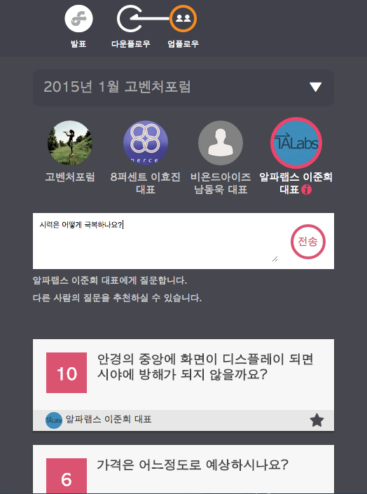 업플로우는, 다운플로우와는 반대로 청중이 발표자에게 보내는 소통의 흐름을 구연합니다. 궁금한 것을 직접 물어보거나 강연에 대한 피드백을 보내는 등의 표현이 가능합니다. 특별히 질문 시간을 만들 필요도 없습니다. 강연 도중 언제든지 질문할 수 있으며, 다른 사람의 질문에 공감할 경우 추천할 수도 있습니다. 모든 질문은 추천수에 맞춰 자동으로 정렬됩니다. 현장에서 많은 사람이 공감하는 질문을 쉽게 확인할 수 있는 것이죠. 또한 특정 발표자를 지정해서 질문할 수도 있습니다.