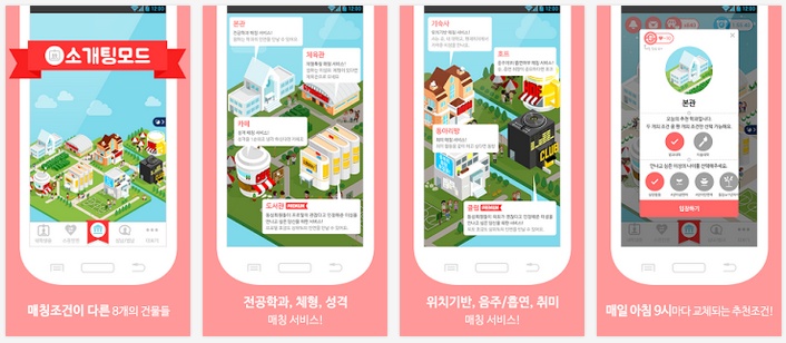 모바일 어플리케이션 개발사 레드스트랩도 최근 소셜데이팅 서비스 ‘캠퍼스팅’을 정식 론칭했다. 소셜데이팅 서비스 캠퍼스팅은 낮과 밤 4개씩 총 8개로 취향을 나눈 건물에서 각자가 원하는 이상형의 상대를 찾고 데이트 상대를 소개 받을 수 있는 어플리케이션이다.