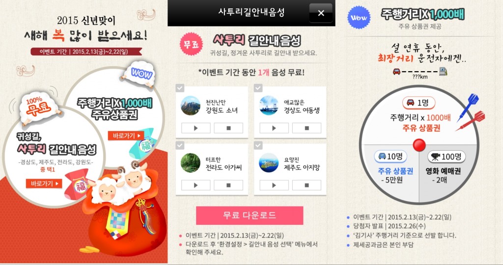 설날 이벤트 동안 김기사 이용자들에게 무료로 제공되는 국민내비 김기사의 사투리 길안내 음성은 총 4가지로 ‘천진난만한 강원도 소녀’, ‘애교 많은 경상도 여동생’, ‘터프한 전라도 아가씨’, ‘요망진 제주도 아지망’으로 구성되어 있으며, 김기사 메인 화면의 복주머니 배너를 클릭하면 누구나 무료로 다운받아 사용할 수 있다.