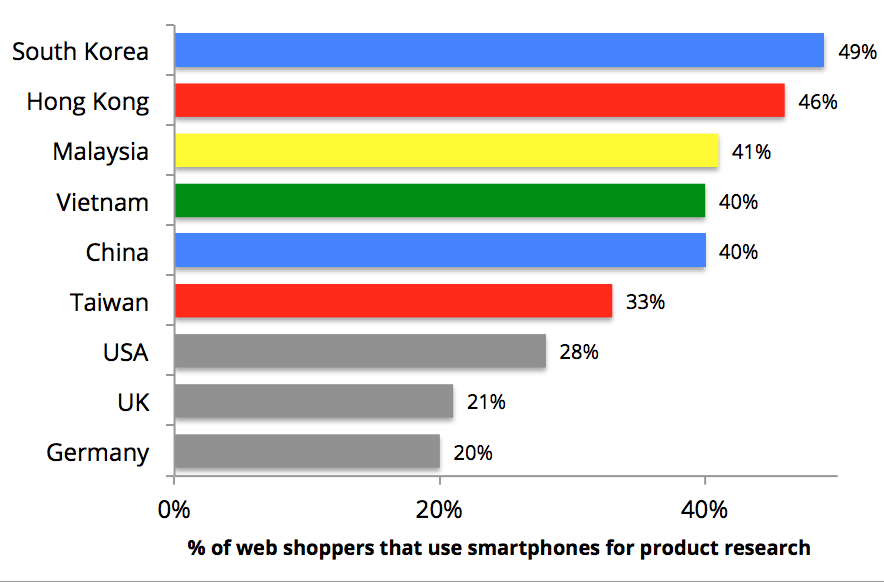 새롭게 인터넷을 사용하게 될 사람의 대부분은 아시아 사람들이 될 것이다. 구글은 매해 전세계 인터넷 사용자를 대상으로 ‘컨슈머 바로미터(Consumer Barometer)’라는 설문을 진행하고 있다. 이에 따르면 스마트폰 사용률이 가장 높은 다섯 나라 중 두 나라는 싱가폴과 대한민국으로 나타났다.