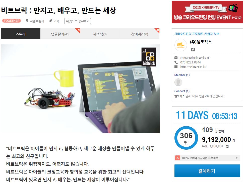 이러한 상황에서, 최근 디지털 세대의 아이들을 위한 교육용 테크키트와 소프트웨어인 ‘비트브릭‘을 개발한 헬로긱스가 와디즈에서 크라우드펀딩을 통해 목표금액의 300%를 돌파해 눈길을 끌고 있다. 헬로긱스가 크라우드펀딩을 통해 공개한 ‘비트브릭’은 선생님 또는 부모님이 아이들과 함께 쉽게 코딩을 학습하고 센서, 모터, LED 등을 레고와 결합하여 쉽고 재밌게 로봇창작을 할 수 있는 혁신제품이다.