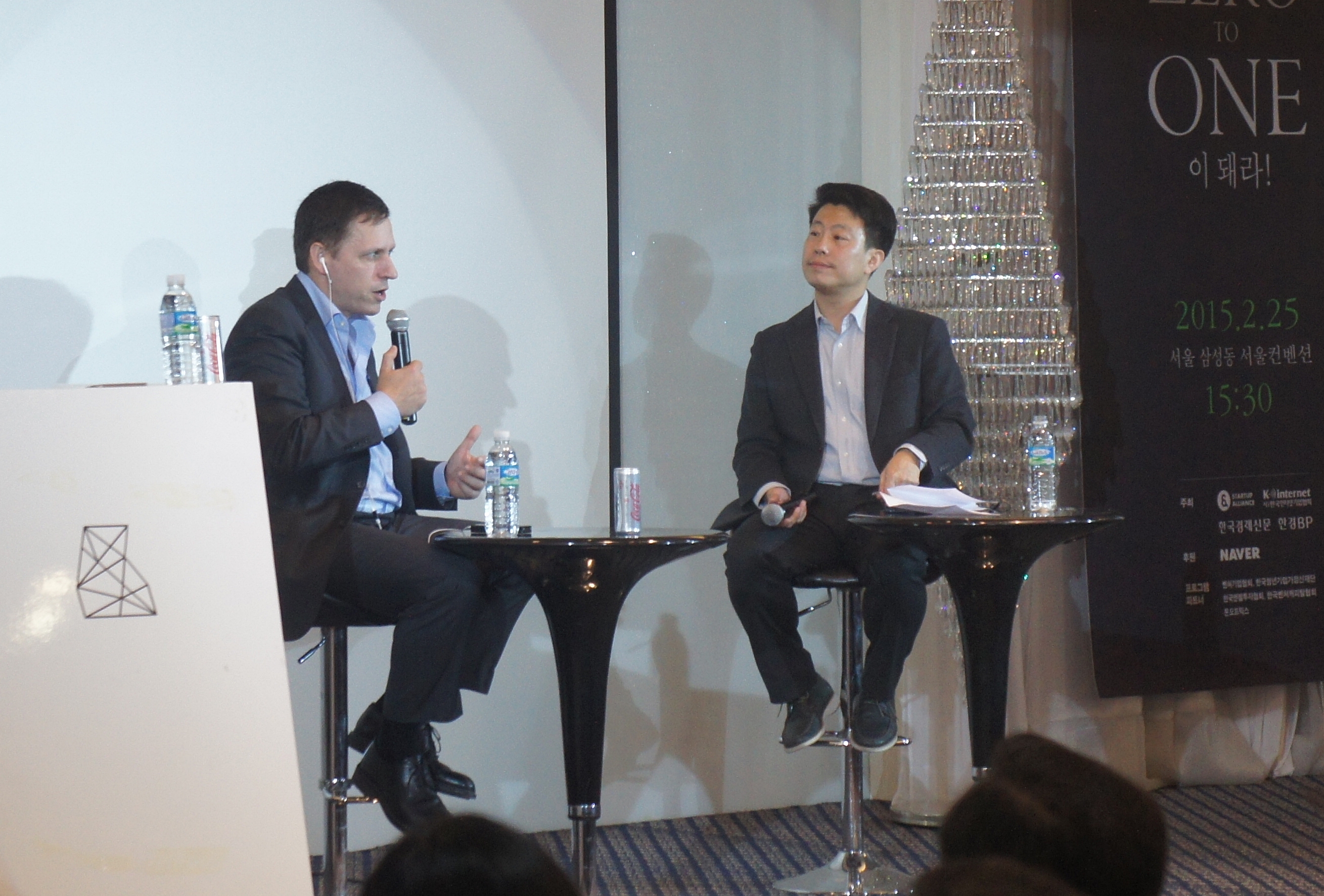 청중의 질문도 이어졌다. 한 청중은 “한국에서는 아무 것도 없는 제로(0) 상태에서 완전히 새로운 시장을 창조해 독점(1)을 실현한 기업을 찾아보기 힘들다”며 이를 “실패를 용납하지 않는 한국 문화”에서 기인한다고 말했다. 이에 틸은 “꼭 한국만의 문화가 아니라 실리콘벨리도 마찬가지로 실패를 하면 다시 회복하기가 쉽지 않다”며 “문화를 바꾸는 것은 쉽지 않다. 하지만 오늘날 실리콘벨리는 성공의 역사와 선례가 쌓여서 이뤄진 것이다. 한국에도 우수한 기술 기업이 많기 때문에 그들로부터 더 많은 영감을 받아 어려움을 극복해야 한다”고 강조했다.