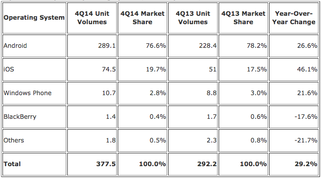 IDC가 발표한 자료에 따르면 지난 4분기 스마트 기기 시장은 총 3억 7750만대 규모였습니다. 이중 안드로이드 운영체제를 기반으로 하는 기기는 2억 8910만대 규모로 전체 시장의 76.6% 를 차지했습니다. 전년 동기 대비로는 26.6% 의 성장을 한 기록적인 수치이지만 애플의 폭발적인 성장세(출하량 기준 YoY 46.1%)에는 미치지 못했습니다. 대화면 아이폰의 효과가 얼마나 컸던 것인지를 다시 한 번 생각해볼 수 있게 해주는 대목입니다.