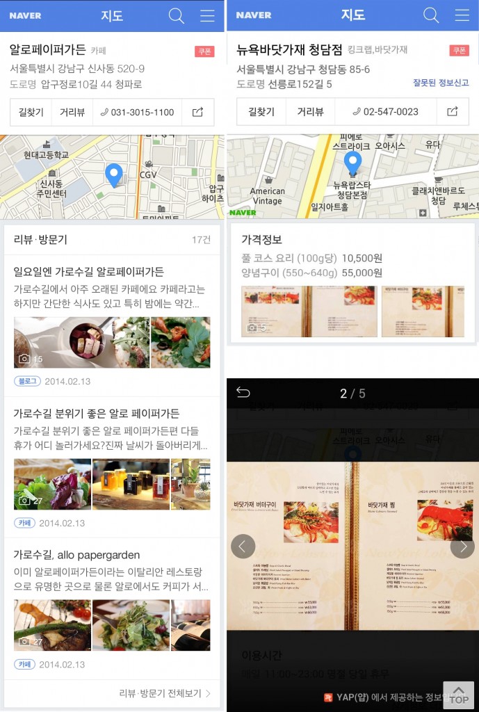 또한, 음식점에 대한 지도 검색에는 리뷰와 더불어 업주 등록, 제휴사 정보, 블로그 등을 통해 확보한 12만 건의 식당 메뉴, 가격정보도 제공하여 이용자들에게 식사장소 탐색 편의를 더했다.