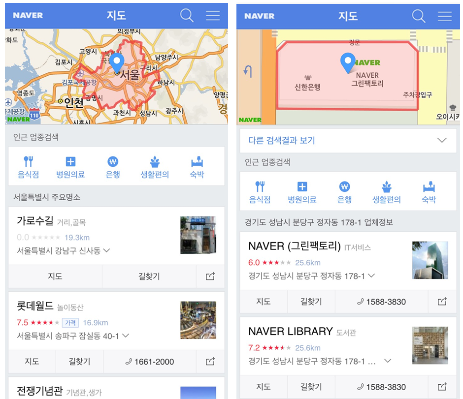 주소 검색시에도 해당 주소지에 위치 범위와 해당 주소지에 위치한 업체들의 정보를 확인할 수 있는 등 보다 편리하게 지역 정보를 활용할 수 있다.