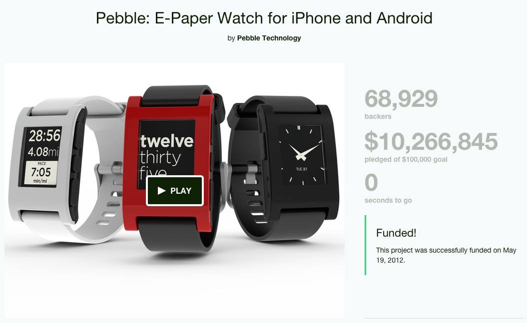 그런데 이런 크라우드 펀딩 플랫폼이 정말로 새로운 제품, 아직 투자가를 찾지 못한 사람들이 이용하는 검증의 채널, 자금 확보의 채널이 아니라 이미 있는 사업을 시작한 기업들이 더 많은 자금을 모으고 자사의 새로운 제품에 대하여 일종의 선구매 고객의 확보 내지는 마케팅을 할 수 있는 채널로 그 활용 용도가 커지고 있습니다. 본격적인 마케팅 채널로의 가치를 증명한 곳은 바로 킥스타터(KickStarter)와 페블(Pebble)입니다. 사실 두 기업은 서로의 이름을 대중들에게 널리 알리는데 서로 도움을 주었던 전례가 있어 더 재미있기도 합니다.