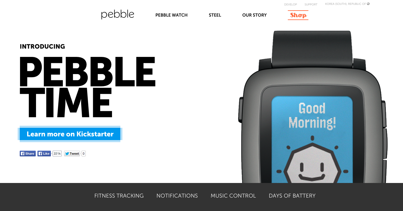 그런데 그런 페블이 어제 다시 킥스타터로 돌아왔습니다. 자사의 3세대 제품은 페블 타임(Pebble Time)을 위한 펀드 모금을 빙자(?)하여 자금도 모으고 새로운 제품에 대한 시장의 수요를 확인하는 한편 선구매 고객들을 확보하는 성과를 거두었습니다. 당초 10만달러를 타겟으로 시작했던 페블의 새로운 프로젝트는 너무 많은 자금이 몰리며 현재 추가 모금이 중단된 상태입니다. 모금된 금액은 놀랍게도 1천만달러(우리돈으로 100억원 이상)를 넘습니다.
