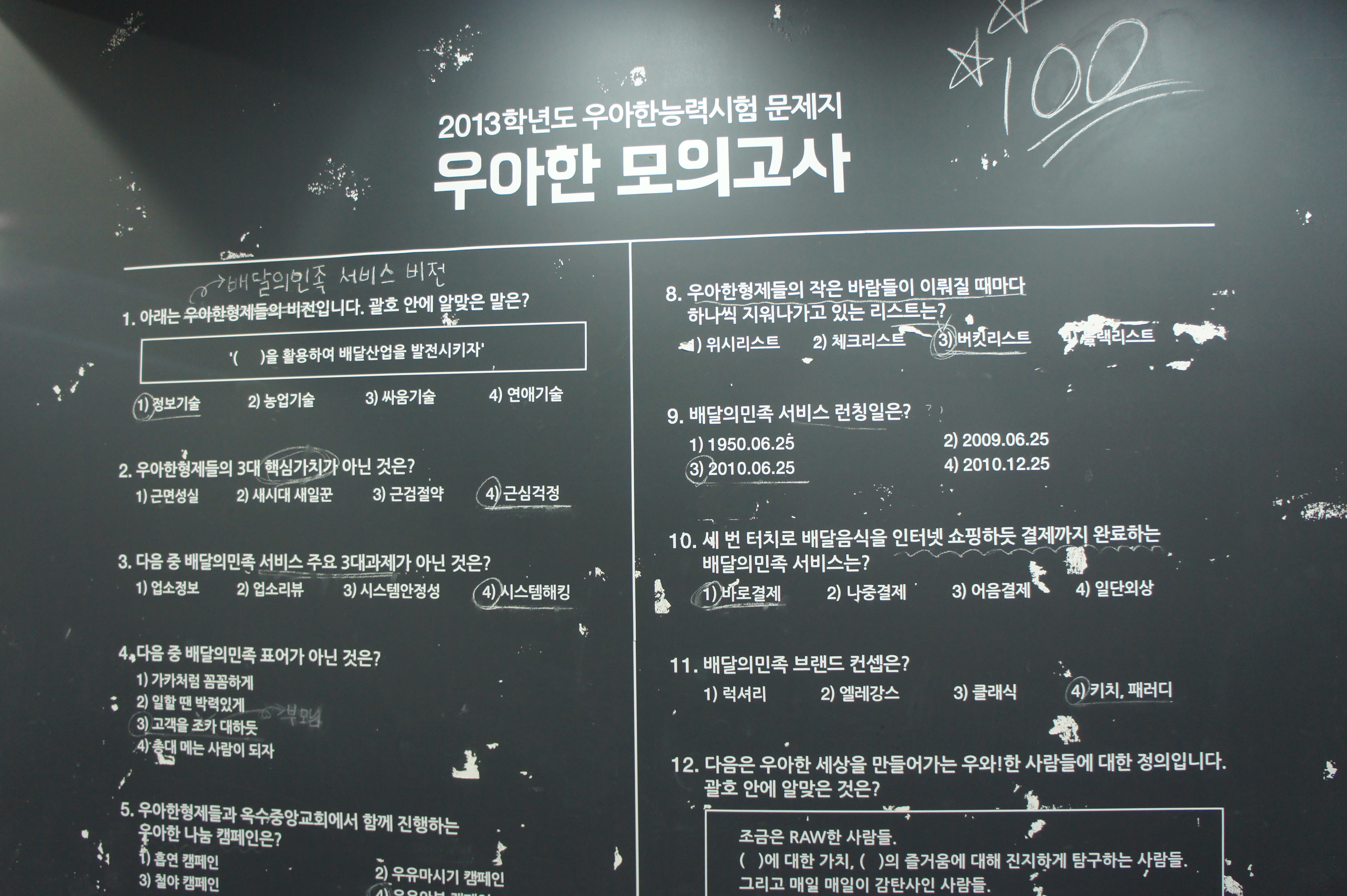 한 쪽 벽에는 우아한 형제들의 기업 문화가 ‘4지 선다형 모의고사’로 표현되어 있다
