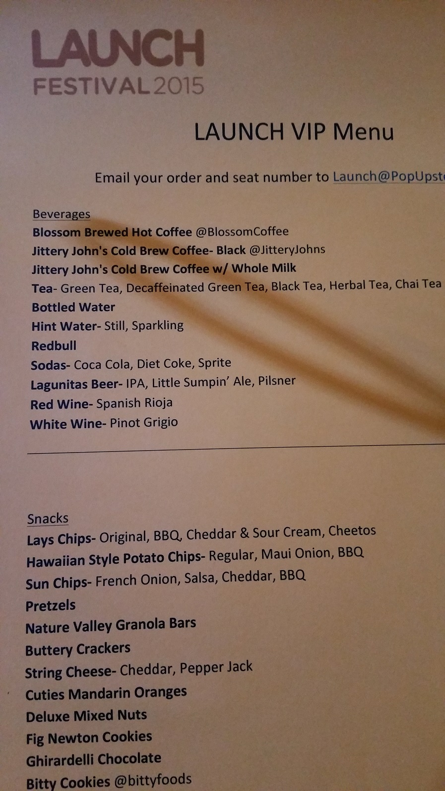 이 행사에는 취지에 맞게 이벤트 자체도 아주 재미있는 서비스를 제공하였다. 앞쪽 열에 앉아 있는 $4,995 하는 Super VIP pass 와 $995 VIP pass 소지자에게는 행사중에 이메일로 원하는 메뉴를 오더하면 웨이터가 직접 테이블로 서빙을 하는 새로운 서비스를 선보였다. 주문한 와인을 마시면서 테이블에 앉아 유명 연사의 세션을 듣는 이색적인 경험은 스타트업 행사와 아주 매칭이 잘 되어 많은 호응을 얻었다.