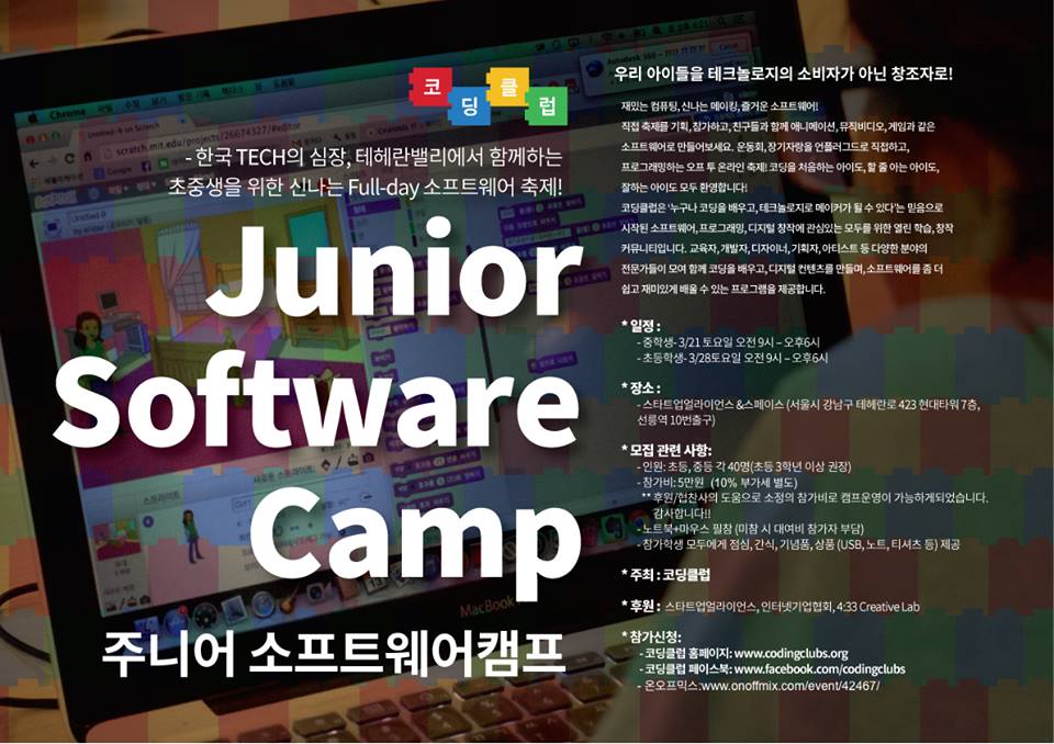 스타트업얼라이언스, 인터넷기업협회 및 4:33 Creative Labs의 후원과 다음카카오의 협찬으로 개최되는 코딩클럽 주니어소프트웨어캠프에서는 ‘축제’를 주제로 오프라인과 온라인 활동을 통해 코딩을 즐길 수 있도록 하였다. 참가자들은 운동회, 장기자랑 등 다양한 놀이를 언플러그드 활동으로 하고, MIT의 교육용 프로그래밍 언어 ‘스크래치’를 통해 소프트웨어로 표현하게 되며, 프로그래밍 기초역량 및 컴퓨터과학적 사고 (Computational Thinking)와 창의적 사고를 배우게 된다.