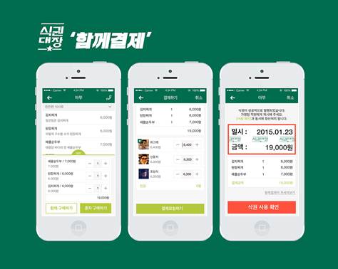 이용 방법은 간단하다. 대표로 결제를 맡은 사람이 자신의 식권대장 앱에서 일행이 먹은 메뉴 전체와 같이 식사한 사람, 개인별 부담액을 차례로 선택한 후 ‘결제요청하기’ 버튼을 누르면, 선택된 사람의 스마트폰으로 ‘식대승인요청’ 알람 메시지가 발송된다. 알람을 받은 사람이 ‘승인’ 버튼을 누르면, 각 개인의 식대 포인트가 대표에게로 전송된다.