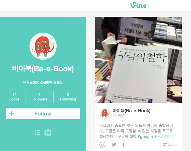 그 짧은 한 주동안에도 바인(Vine)에 마련한 벤처스퀘어 소셜리딩 페이지를 찾아주신 분들이 있으셨답니다. 특히 Jihoon Kim과 Sorrow님이 포스팅에 좋아요(like)을 콕콕 박아놓았고요.