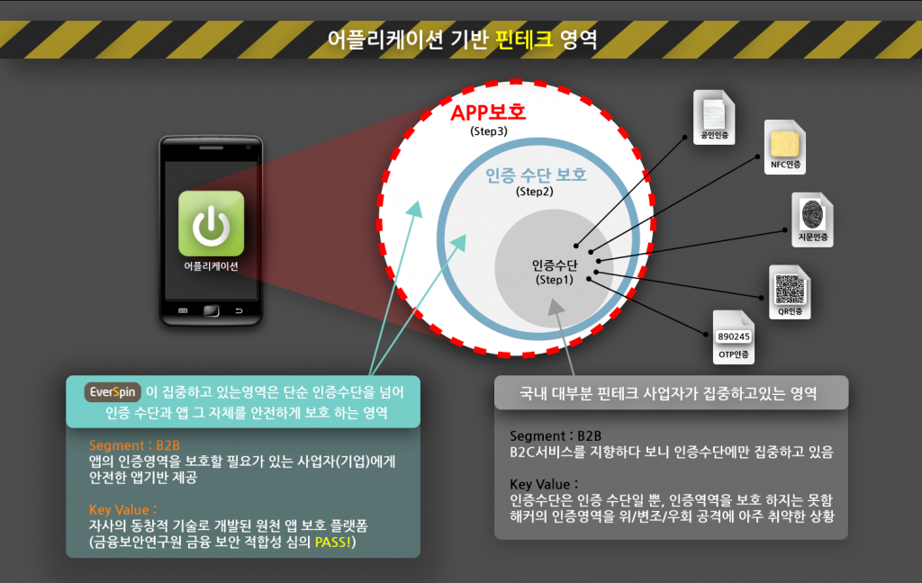 “애플리케이션이 안전하지 않으면 어떤 인증수단도 안전하지 않다. NFC 인증, 바코드인증, QR 코드인증 등 정말 안전한가? 내 정보는 안전한가? 앱이 뚫리면 다 뚫린다. 에버스핀은 애플리케이션 보안을 가장 최우선으로 하는 기업이다”